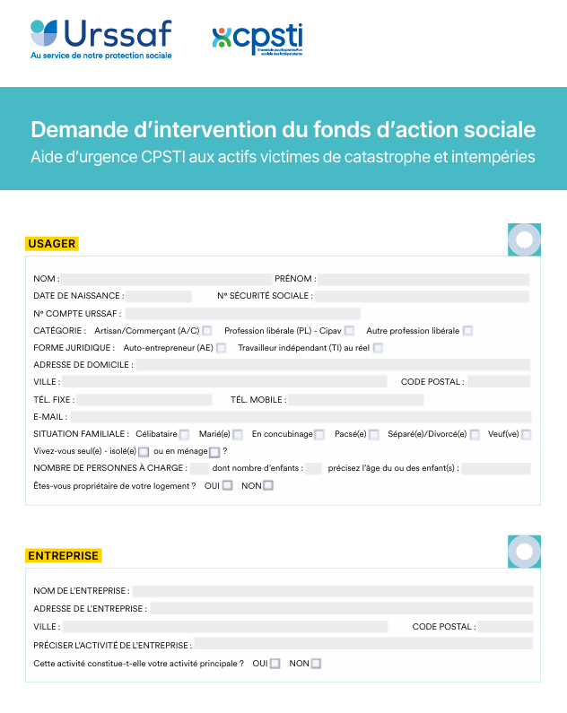 Le CPSTI (Conseil de la protection sociale des travailleurs indépendants) a mis en place une aide d’urgence spécifique destinée aux actifs victimes de catastrophe et d’intempéries.